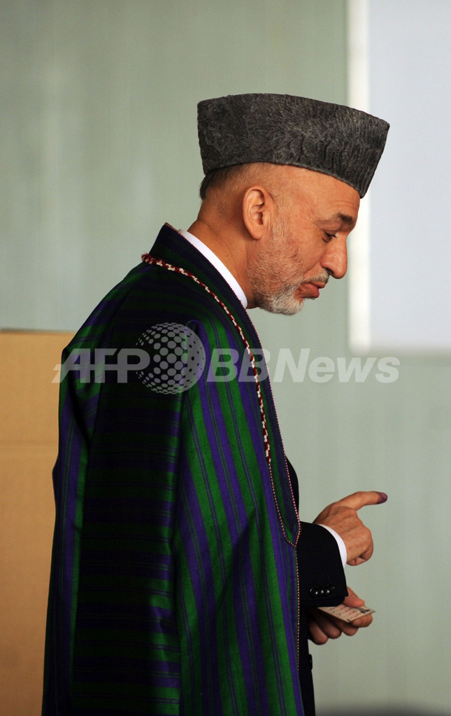 写真は、カブール(Kabul)の投票所で投票するハミド・カルザイ(Hamid Karzai)大統領(2009年8月20日撮影)。(c)AFP/SHAH Marai