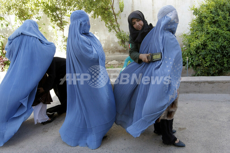 写真は、へラート(Herat)の投票所前で検査をする女性警官(2009年8月20日撮影)。(c)AFP/BEHROUZ MEHRI