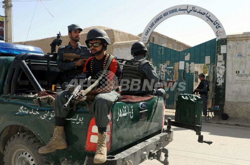 写真は、カンダハル(Kandahar)の投票所周辺を警備する警官ら(2009年8月20日撮影)。(c)AFP/BANARAS KHAN