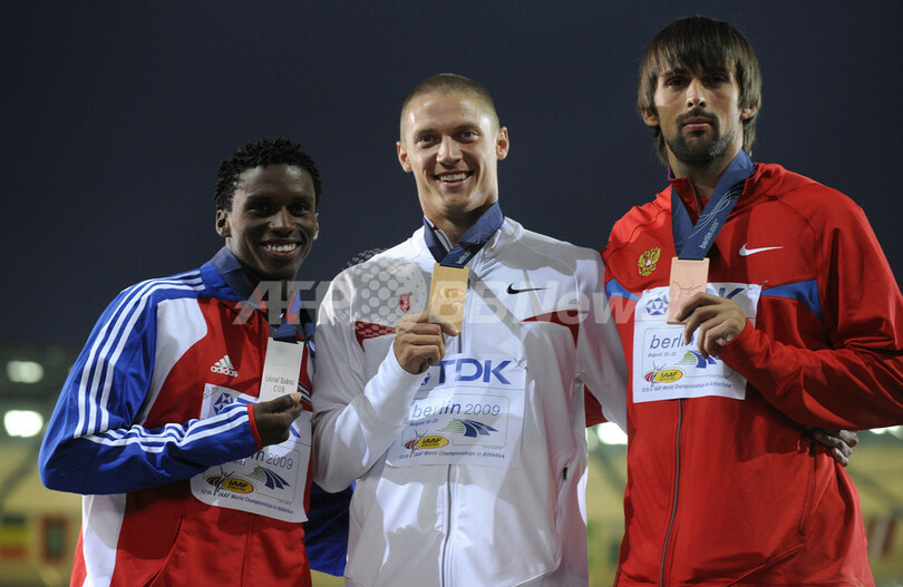 2位には8640点でレオネル・スアレス(%%Leonel Suarez%%、キューバ)が、3位には8528点でアレクサンドル・ポゴレロフ(%%Aleksandr Pogorelov%%、ロシア)が入り、池田大介(%%Daisuke Ikeda%%、日本)は自己ベストとなる7788点で26位だった。写真は表彰式に臨む(左から)レオネル・スアレス、トレイ・ハーディ、アレクサンドル・ポゴレロフ。(2009年8月21日撮影)(c)AFP/JOHN MACDOUGALL