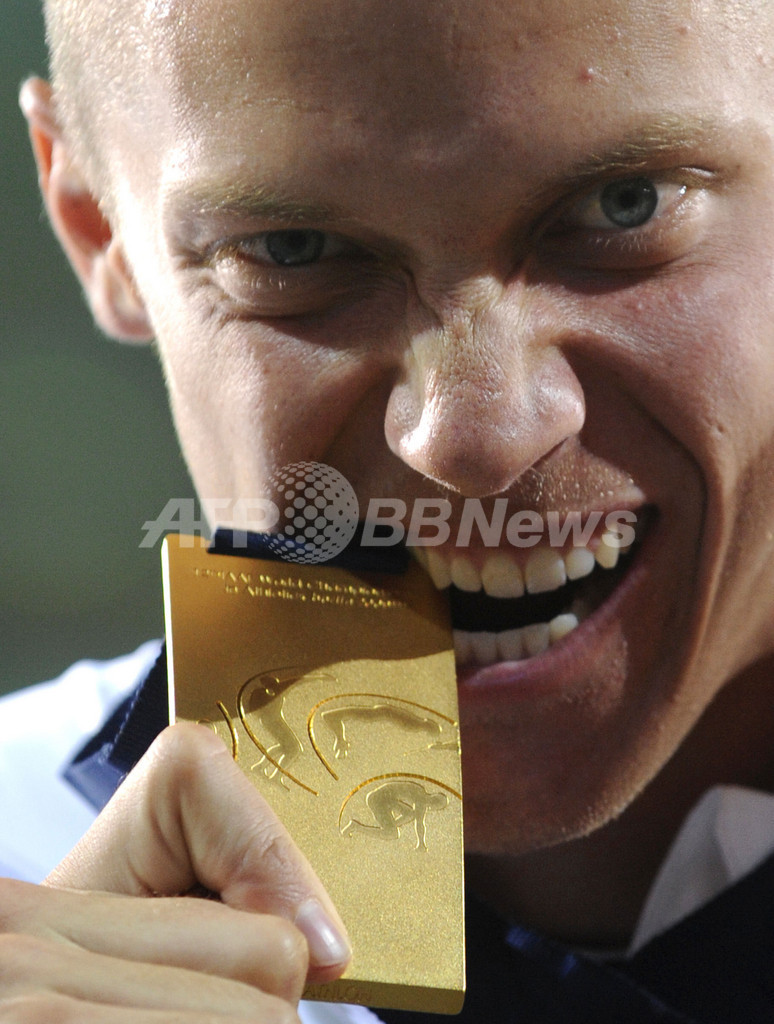 2位には8640点でレオネル・スアレス(%%Leonel Suarez%%、キューバ)が、3位には8528点でアレクサンドル・ポゴレロフ(%%Aleksandr Pogorelov%%、ロシア)が入り、池田大介(%%Daisuke Ikeda%%、日本)は自己ベストとなる7788点で26位だった。写真は表彰式でメダルを手にポーズをとるトレイ・ハーディ。(2009年8月21日撮影)(c)AFP/JOHN MACDOUGALL