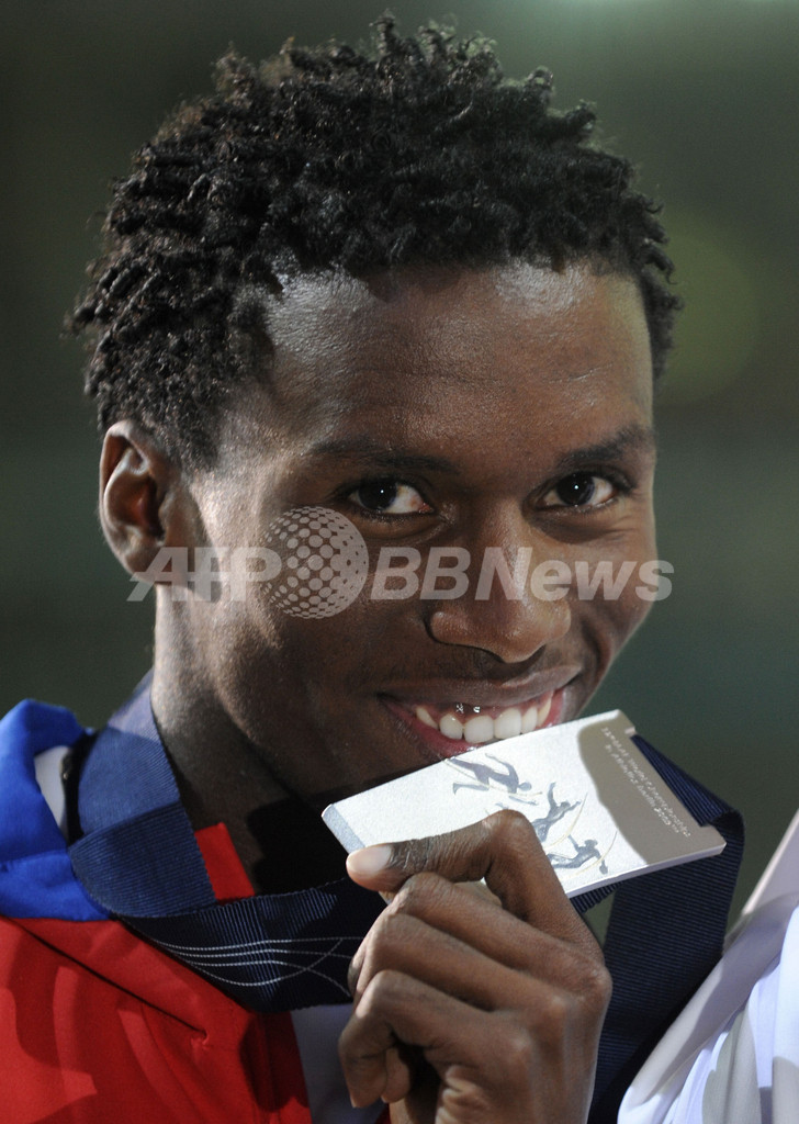 2位には8640点でレオネル・スアレス(%%Leonel Suarez%%、キューバ)が、3位には8528点でアレクサンドル・ポゴレロフ(%%Aleksandr Pogorelov%%、ロシア)が入り、池田大介(%%Daisuke Ikeda%%、日本)は自己ベストとなる7788点で26位だった。写真は表彰式でメダルを手にポーズをとるレオネル・スアレス。(2009年8月21日撮影)(c)AFP/JOHN MACDOUGALL