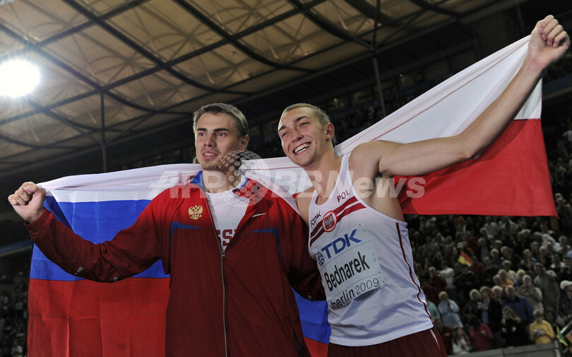 2位にはルイバコフと同記録ながらも跳躍回数が多かったキリアコス・イオアヌ(%%Kyriakos Ioannou%%、キプロス)が、3位には同じく同記録で跳躍回数によりラウル・シュパンク(%%Raul Spank%%、ドイツ)とシルウェスター・ベドナレク(%%Sylwester Bednarek%%、ポーランド)が入った。写真は国旗を掲げるヤロスラフ・ルイバコフ(左)とシルウェスター・ベドナレク。(2009年8月21日撮影)(c)AFP/ADRIAN DENNIS