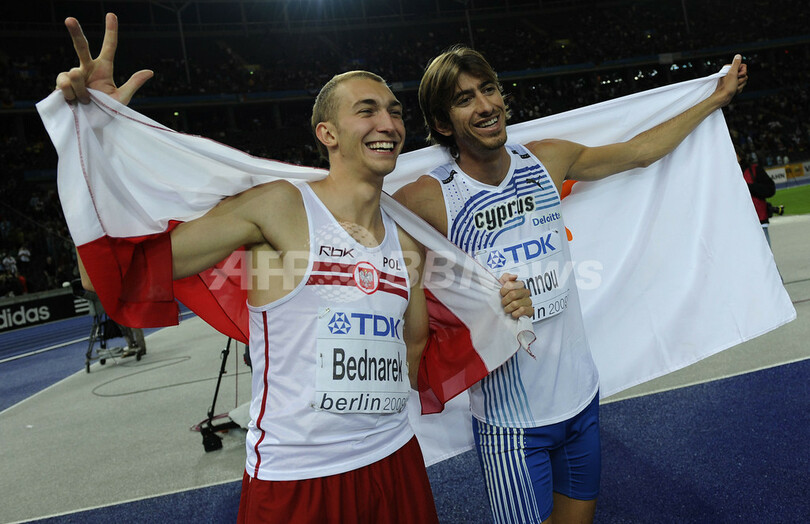 2位にはルイバコフと同記録ながらも跳躍回数が多かったキリアコス・イオアヌ(%%Kyriakos Ioannou%%、キプロス)が、3位には同じく同記録で跳躍回数によりラウル・シュパンク(%%Raul Spank%%、ドイツ)とシルウェスター・ベドナレク(%%Sylwester Bednarek%%、ポーランド)が入った。写真は国旗を掲げるシルウェスター・ベドナレク(左)とキリアコス・イオアヌ。(2009年8月21日撮影)(c)AFP/ADRIAN DENNIS