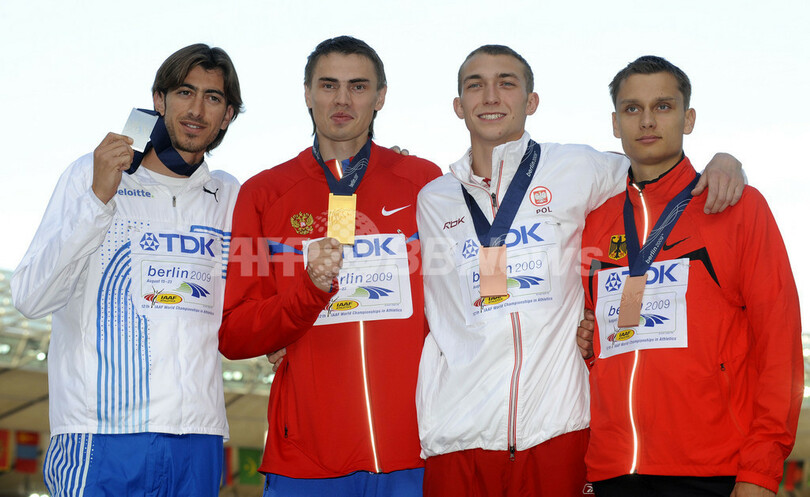 2位にはルイバコフと同記録ながらも跳躍回数が多かったキリアコス・イオアヌ(%%Kyriakos Ioannou%%、キプロス)が、3位には同じく同記録で跳躍回数によりラウル・シュパンク(%%Raul Spank%%、ドイツ)とシルウェスター・ベドナレク(%%Sylwester Bednarek%%、ポーランド)が入った。写真は表彰台でポーズをとる(左から)2位のキリアコス・イオアヌ、優勝したヤロスラフ・ルイバコフ、3位のシルウェスター・ベドナレクとラウル・シュパンク。(2009年8月22日撮影)(c)AFP/JOHN MACDOUGALL