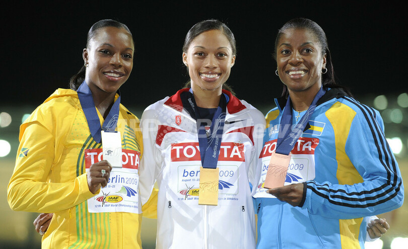 2位には22秒35で五輪2連覇中のベロニカ・キャンベル(%%Veronica Campbell%%、ジャマイカ)が、3位には22秒41でデビー・ファーガソン・マッケンジー(%%Debbie Ferguson-McKenzie%%、バハマ)が入った。写真は表彰式に臨む(左から)ベロニカ・キャンベル、アリソン・フェリックス、デビー・ファーガソン・マッケンジー。(2009年8月21日撮影)(c)AFP/JOHN MACDOUGALL
