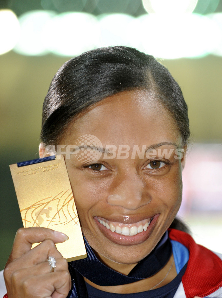 2位には22秒35で五輪2連覇中のベロニカ・キャンベル(%%Veronica Campbell%%、ジャマイカ)が、3位には22秒41でデビー・ファーガソン・マッケンジー(%%Debbie Ferguson-McKenzie%%、バハマ)が入った。写真は表彰式でメダルを手にポーズをとるアリソン・フェリックス。(2009年8月21日撮影)(c)AFP/JOHN MACDOUGALL