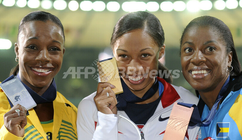 2位には22秒35で五輪2連覇中のベロニカ・キャンベル(%%Veronica Campbell%%、ジャマイカ)が、3位には22秒41でデビー・ファーガソン・マッケンジー(%%Debbie Ferguson-McKenzie%%、バハマ)が入った。写真は表彰式でメダルを掲げる(左から)ベロニカ・キャンベル、アリソン・フェリックス、デビー・ファーガソン・マッケンジー。(2009年8月21日撮影)(c)AFP/JOHN MACDOUGALL