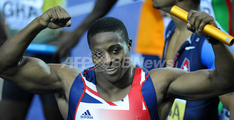 前回優勝の米国は2組1位だったが、第3走のショーン・クロフォード(%%Shawn Crawford%%)からダービス・パットン(%%Darvis Patton%%)へのバトン受け渡しが規定の範囲を越えていたため、失格処分となった。写真は予選2組を通過し歓喜する英国のハリー・アイキネスアリエティ(%%Harry Aikines-Aryeetey%%)。(2009年8月21日撮影)(c)AFP/JOHN MACDOUGALL