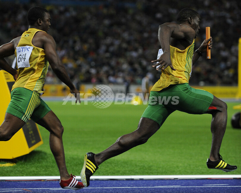前回優勝の米国は2組1位だったが、第3走のショーン・クロフォード(%%Shawn Crawford%%)からダービス・パットン(%%Darvis Patton%%)へのバトン受け渡しが規定の範囲を越えていたため、失格処分となった。写真は予選3組に臨むジャマイカのスティーブ・マリングス(%%Steve Mullings%%)とドワイト・トーマス(%%Dwight Thomas%%)。(2009年8月21日撮影)(c)AFP/ADRIAN DENNIS