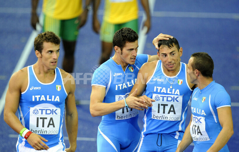 前回優勝の米国は2組1位だったが、第3走のショーン・クロフォード(%%Shawn Crawford%%)からダービス・パットン(%%Darvis Patton%%)へのバトン受け渡しが規定の範囲を越えていたため、失格処分となった。写真は予選3組を1位で通過し歓喜するイタリアの選手。(2009年8月21日撮影)(c)AFP/THOMAS LOHNES