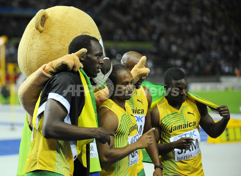 ウサイン・ボルト(%%Usain Bolt%%)は、第3走者としてジャマイカの金メダル獲得に貢献し、%%北京五輪%%に続き世界選手権でも短距離(100メートル、200メートル、4×100メートルリレー)3冠に輝いた。写真は大会公式マスコットのベルリーノ(Berlino)と一緒に記念撮影を行なうジャマイカの選手たち。(2009年8月22日撮影)(c)AFP/FRANCK FIFE