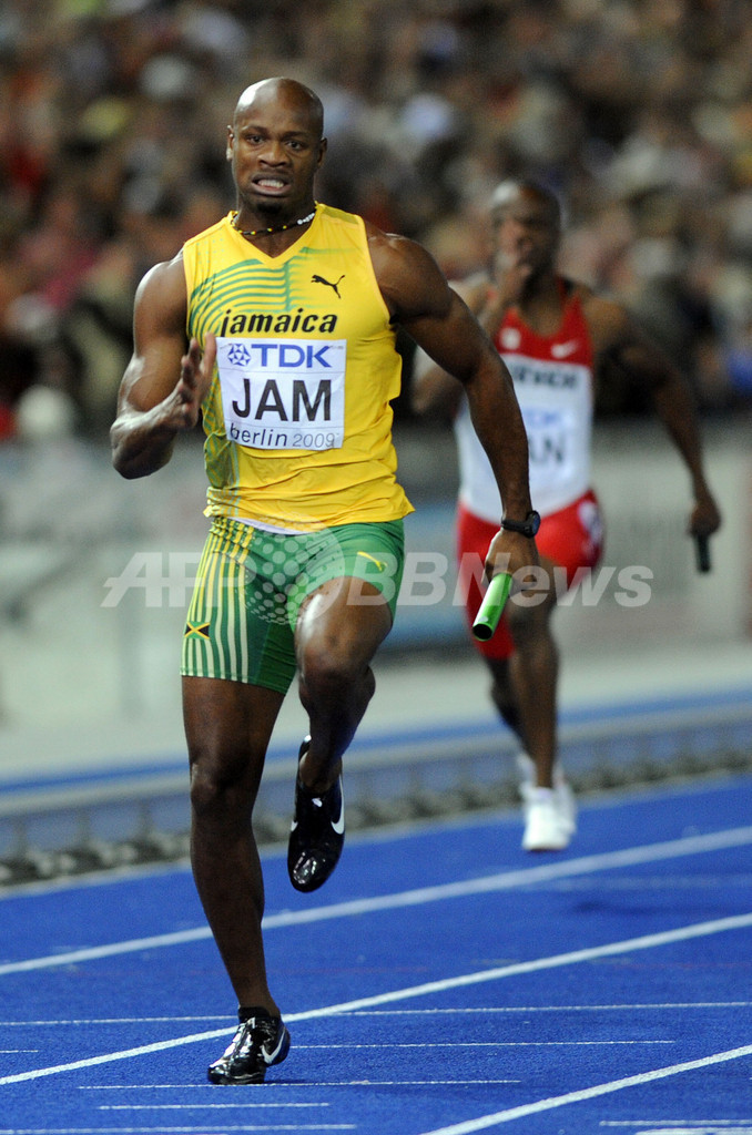 ウサイン・ボルト(%%Usain Bolt%%)は、第3走者としてジャマイカの金メダル獲得に貢献し、%%北京五輪%%に続き世界選手権でも短距離(100メートル、200メートル、4×100メートルリレー)3冠に輝いた。写真は男子4×100メートルリレー決勝に出場するアサファ・パウエル(%%Asafa Powell%%)。(2009年8月22日撮影)(c)AFP/OLIVIER MORIN