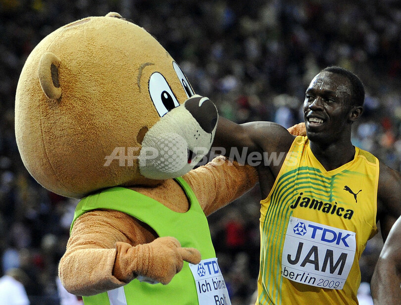 ウサイン・ボルト(%%Usain Bolt%%)は、第3走者としてジャマイカの金メダル獲得に貢献し、%%北京五輪%%に続き世界選手権でも短距離(100メートル、200メートル、4×100メートルリレー)3冠に輝いた。写真は優勝を果たし、大会公式マスコットのベルリーノ(Berlino)と喜ぶウサイン・ボルト(右)。(2009年8月22日撮影)(c)AFP/OLIVIER MORIN