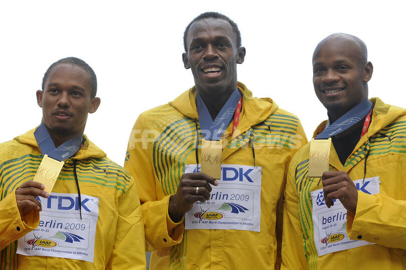 ボルトの北京五輪3冠と今大会3冠の唯一の違いは、個人競技では世界新記録を樹立したが、リレーでは世界新記録を樹立できなかったことだった。ボルトは、「世界記録が出せなかったことに関しては、疲れていた僕に非がある」と語っている。この発言に対し、チームメイトのアサファ・パウエル(Asafa Powell)は、「そうだ、すべてウサインが悪い」と冗談を飛ばしていた。(c)AFP