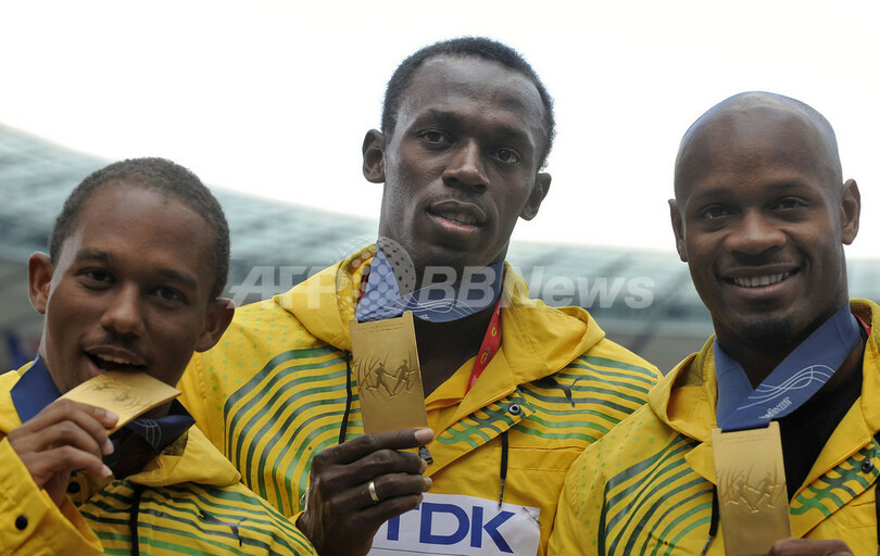 ボルトの北京五輪3冠と今大会3冠の唯一の違いは、個人競技では世界新記録を樹立したが、リレーでは世界新記録を樹立できなかったことだった。ボルトは、「世界記録が出せなかったことに関しては、疲れていた僕に非がある」と語っている。この発言に対し、チームメイトのアサファ・パウエル(Asafa Powell)は、「そうだ、すべてウサインが悪い」と冗談を飛ばしていた。(c)AFP