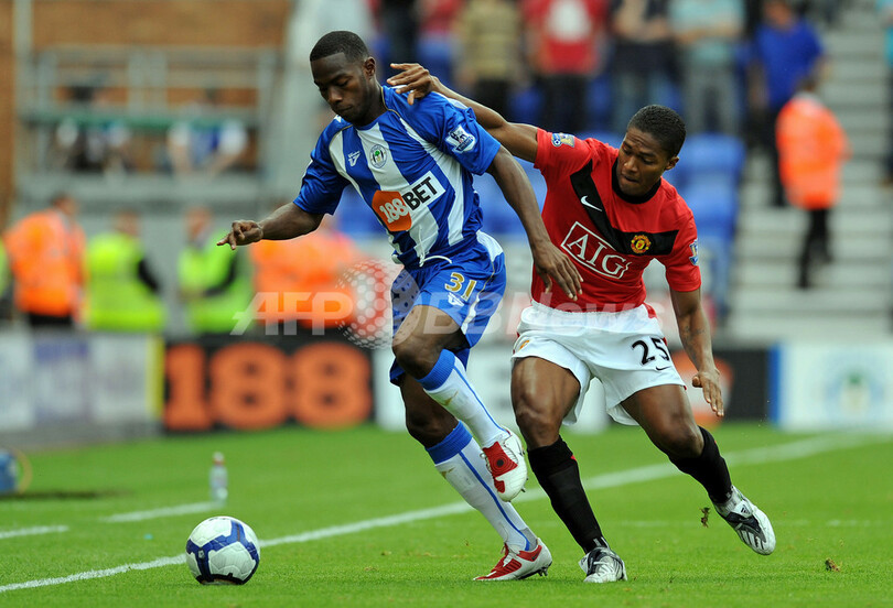 19日の試合で新昇格のバーンリーFC(%%Burnley FC%%)に敗れていた王者マンチェスター・ユナイテッドは、ディミタール・ベルバトフ(%%Dimitar Berbatov%%)やウェイン・ルーニー(%%Wayne Rooney%%)の得点でシーズン2勝目を挙げた。写真はマンチェスター・ユナイテッドのルイス・アントニオ・バレンシア(%%Luis Antonio Valencia%%)とボールを競るウィガンのマイノル・フィゲロア(%%Maynor Figueroa%%、左)。(2009年8月22日撮影)(c)AFP/PAUL ELLIS