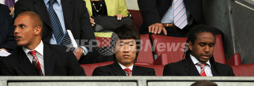 19日の試合で新昇格のバーンリーFC(%%Burnley FC%%)に敗れていた王者マンチェスター・ユナイテッドは、ディミタール・ベルバトフ(%%Dimitar Berbatov%%)やウェイン・ルーニー(%%Wayne Rooney%%)の得点でシーズン2勝目を挙げた。写真はスタンドから戦況を見守るマンチェスター・ユナイテッドの(左から)ウェス・ブラウン(%%Wes Brown%%)、朴智星(%%Park Ji-Sung%%、パク・チソン)、アンデルソン(%%Anderson Oliveira%%)。(2009年8月22日撮影)(c)AFP/PAUL ELLIS