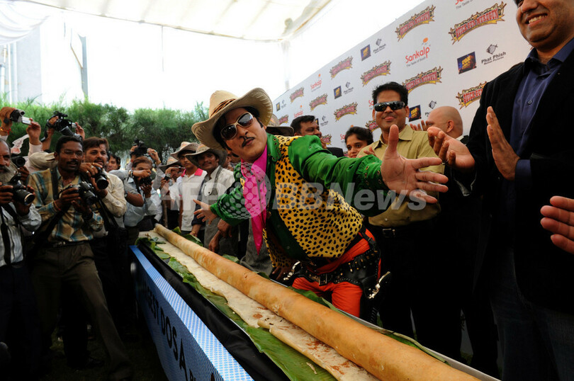 【8月23日 AFP】インドのグジャラート(Gujarat)州アーメダバード(Ahmedabad)のレストランで31日、約10メートルの「ドーサ」(インドのクレープ)が作られ、2月に打ち立てられた9メートルのギネス世界記録(Guinness World Record)を抜いた。