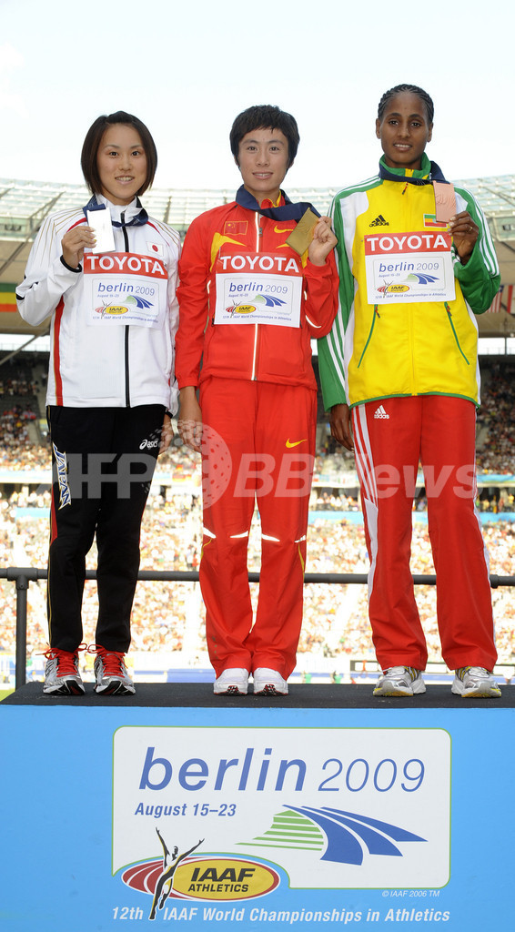 中国の白雪(%%Xue Bai%%)が2時間25分15秒で優勝し、エチオピアのアセレフェチ・メルギア(%%Aselefech Mergia%%)が2時間25分32秒で3位に入った。写真はメダルを手にポーズをとる(左から)尾崎好美、白雪、アセレフェチ・メルギア。(2009年8月23日撮影)(c)AFP/DDP/JOHN MACDOUGALL