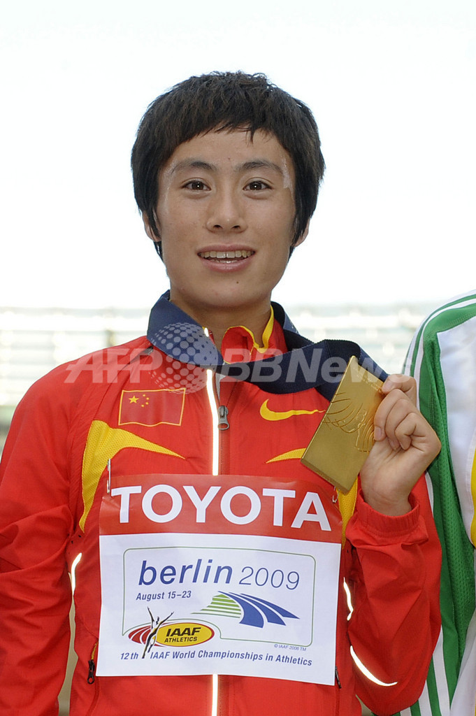 中国の白雪(%%Xue Bai%%)が2時間25分15秒で優勝し、エチオピアのアセレフェチ・メルギア(%%Aselefech Mergia%%)が2時間25分32秒で3位に入った。写真は金メダルを手にポーズをとる白雪。(2009年8月23日撮影)(c)AFP/DDP/JOHN MACDOUGALL