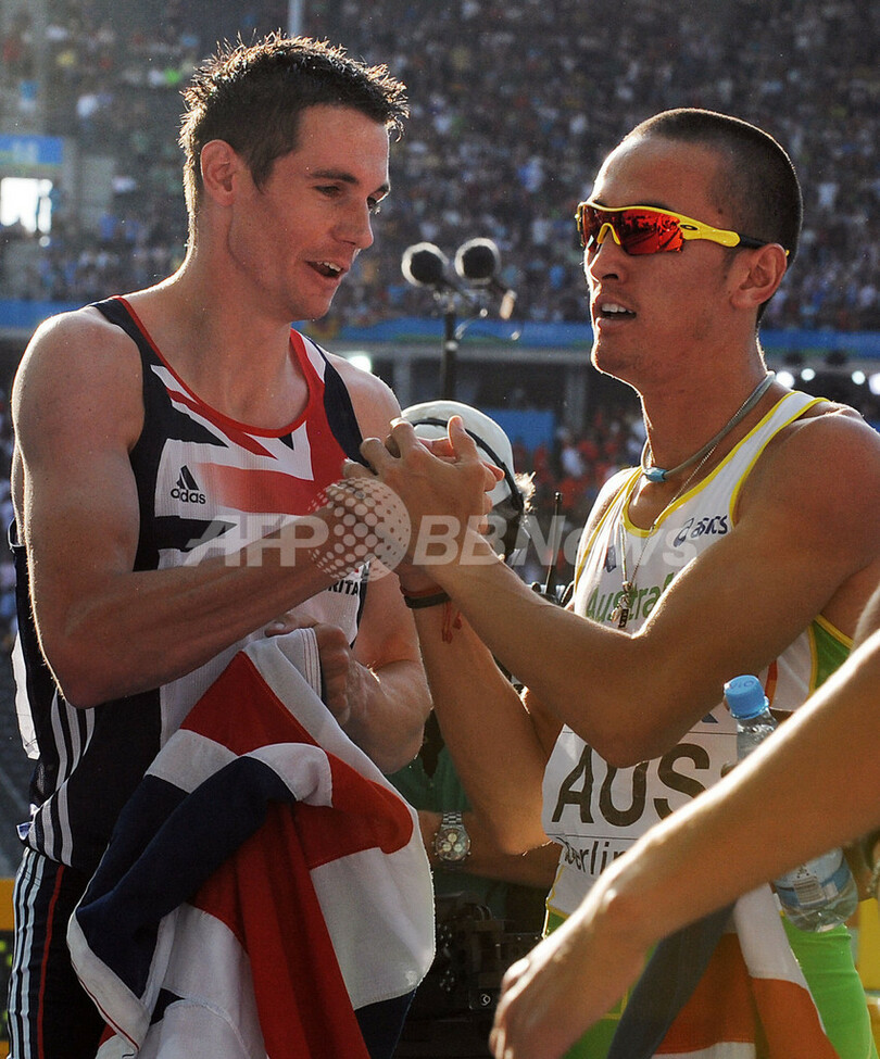 3分0秒53で英国が2位、3分0秒90でオーストラリアが3位に入った。写真は健闘を称えあう英国のマーティン・ルーニー(%%Martyn Rooney%%)とオーストラリアのショーン・ロウ(%%Sean Wroe%%、右)。(2009年8月23日撮影)(c)AFP/OLIVIER MORIN