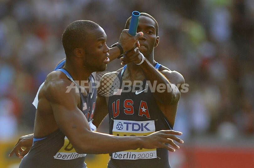 3分0秒53で英国が2位、3分0秒90でオーストラリアが3位に入った。写真はラショーン・メリット(%%LaShawn Merritt%%)にバトンを渡す米国のカーロン・クレメント(%%Kerron Clement%%、右)。(2009年8月23日撮影)(c)AFP/OLIVIER MORIN