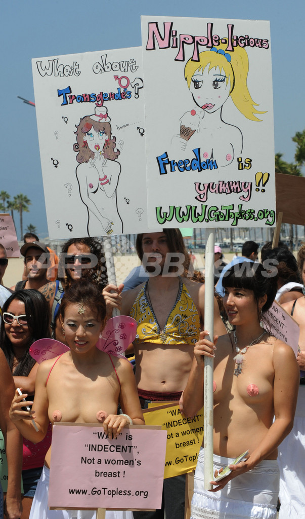 【8月24日 AFP】(写真追加)米カリフォルニア(California)州ベニスビーチ(Venice Beach)で23日、女性の権利平等を記念する「Women's Equality Day」を前に、トップレス女性らが、女性にも男性同様に公共の場で上半身裸になる権利を認めるよう訴えた。(c)AFP