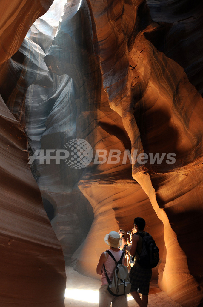 【8月26日 AFP】アリゾナ(Arizona)州ページ(Page)近くにある「アンテロープキャニオン(Antelope Canyon)」。先住民ナバホ(Navajo)の言葉で「水が岩を流れる場所」という意味を持つ「アッパー・アンテロープキャニオン(Upper Antelope Canyon)」は標高約1220メートルに位置し、岩壁は川床から約37メートルにのぼる。同じく「らせん状の岩のアーチ」の意味を持つ「ロウワー・アンテロープキャニオン(Lower Antelope Canyon)」とともにナバホ居留地のLeChee Chapter内にある。年間を通して乾燥しているが、雨の後にはときどき洪水が起こる。この水によって砂岩が徐々に削り取られ、美しく優雅なカーブが形作られた。風もまた峡谷の形成に一役買っている。(c)AFP