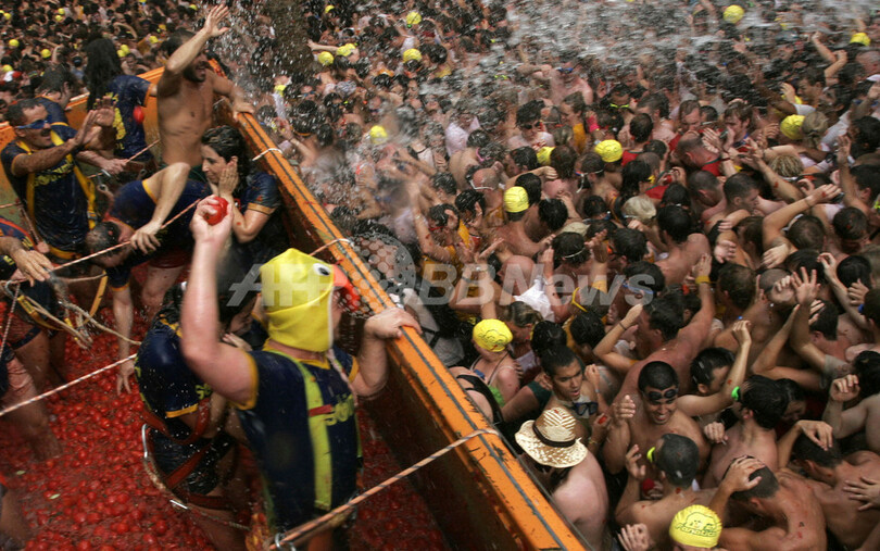 ニュース ライフ こぼれ話 スペインの街、恒例のトマト祭りで真っ赤に染まる 2009年8月27日 8:31 発信地:ブニョール/スペイン [ ヨーロッパ スペイン ] このニュースをシェア ‹ › ❮ 3/9 ❯ スペイン・バレンシア地方のブニョール(Bunol)で26日、熟れたトマトを投げ合う毎年恒例の祭り「トマティーナ(Tomatina)」が開催された。今年で64回目になるこの祭りにはオーストラリア、英国、米国など世界各地から4万人以上が参加。市が提供した100トン以上のトマトを約1時間にわたって投げ合い、参加者は全身真っ赤に染まり、足首までつぶれたトマトに漬かった。写真は、トマトを投げ合う参加者たち(2009年8月26日撮影)。(c)AFP/PABLO ARGENTE 画像作成中 ! 【8月27日 AFP】スペイン・バレンシア地方のブニョール(Bunol)で26日、熟れたトマトを投げ合う毎年恒例の祭り「トマティーナ(Tomatina)」が開催された。 今年で64回目になるこの祭りにはオーストラリア、英国、米国など世界各地から4万人以上が参加。市が提供した100トン以上のトマトを約1時間にわたって投げ合い、参加者は全身真っ赤に染まり、足首までつぶれたトマトに漬かった。(c)AFP ライフ 一覧へ> メディア・報道関係・法人の方向け 写真・動画 購入のお問合せ>