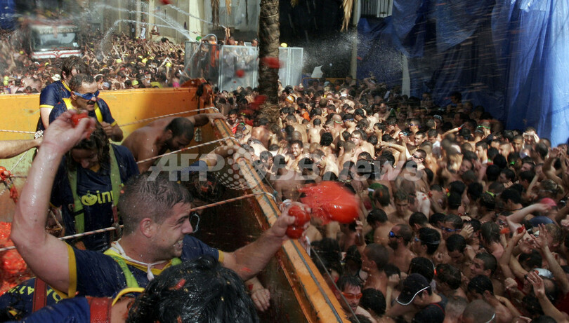 ニュース ライフ こぼれ話 スペインの街、恒例のトマト祭りで真っ赤に染まる 2009年8月27日 8:31 発信地:ブニョール/スペイン [ ヨーロッパ スペイン ] このニュースをシェア ‹ › ❮ 2/9 ❯ スペイン・バレンシア地方のブニョール(Bunol)で26日、熟れたトマトを投げ合う毎年恒例の祭り「トマティーナ(Tomatina)」が開催された。今年で64回目になるこの祭りにはオーストラリア、英国、米国など世界各地から4万人以上が参加。市が提供した100トン以上のトマトを約1時間にわたって投げ合い、参加者は全身真っ赤に染まり、足首までつぶれたトマトに漬かった。写真は、トマトを投げ合う参加者たち(2009年8月26日撮影)。(c)AFP/PABLO ARGENTE 画像作成中 ! 【8月27日 AFP】スペイン・バレンシア地方のブニョール(Bunol)で26日、熟れたトマトを投げ合う毎年恒例の祭り「トマティーナ(Tomatina)」が開催された。 今年で64回目になるこの祭りにはオーストラリア、英国、米国など世界各地から4万人以上が参加。市が提供した100トン以上のトマトを約1時間にわたって投げ合い、参加者は全身真っ赤に染まり、足首までつぶれたトマトに漬かった。(c)AFP ライフ 一覧へ> メディア・報道関係・法人の方向け 写真・動画 購入のお問合せ>