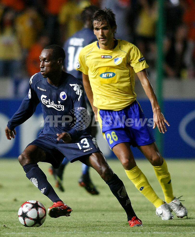 サッカー欧州チャンピオンズリーグ2009-10(%%UEFA Champions League 2009-10%%)プレーオフ、アポエルFC(%%APOEL FC%%)対FCコペンハーゲン(%%FC Kopenhavn%%)第2戦。試合はアポエルが3-1で勝利し、2試合合計スコア3-2でグループリーグ進出を決めた。写真はアティバ・ハッチンソン(%%Atiba Hutchinson%%)をマークするアポエルのヌーノ・モライス(%%Nuno Morais%%、右)。(2009年8月26日撮影)(c)AFP/SAKIS SAVVIDES