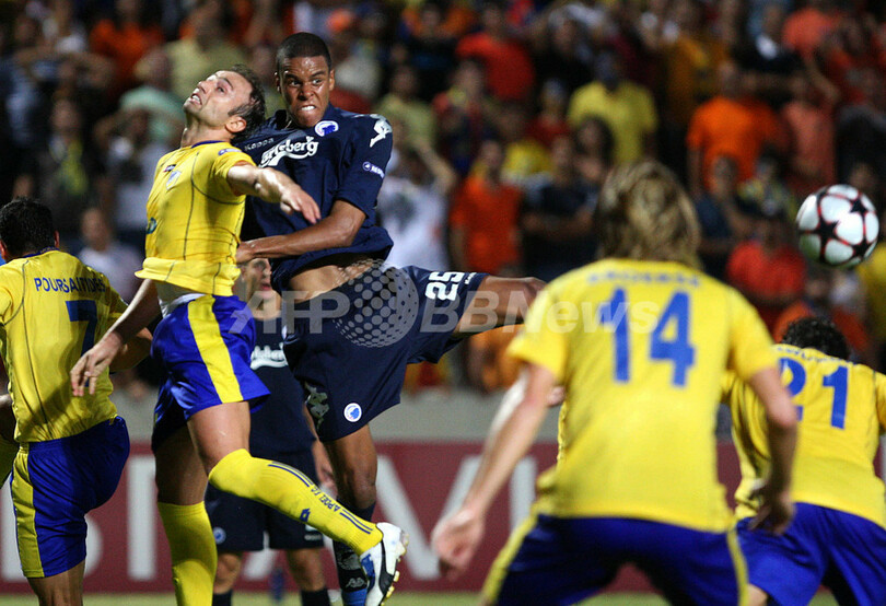 サッカー欧州チャンピオンズリーグ2009-10(%%UEFA Champions League 2009-10%%)プレーオフ、アポエルFC(%%APOEL FC%%)対FCコペンハーゲン(%%FC Kopenhavn%%)第2戦。試合はアポエルが3-1で勝利し、2試合合計スコア3-2でグループリーグ進出を決めた。写真はクリストス・コンティス(%%Christos Kontis%%、左)と競り合うコペンハーゲンのマティアス・ヨルゲンセン(%%Mathias Zanka Jorgensen%%、左2)。(2009年8月26日撮影)(c)AFP/SAKIS SAVVIDES