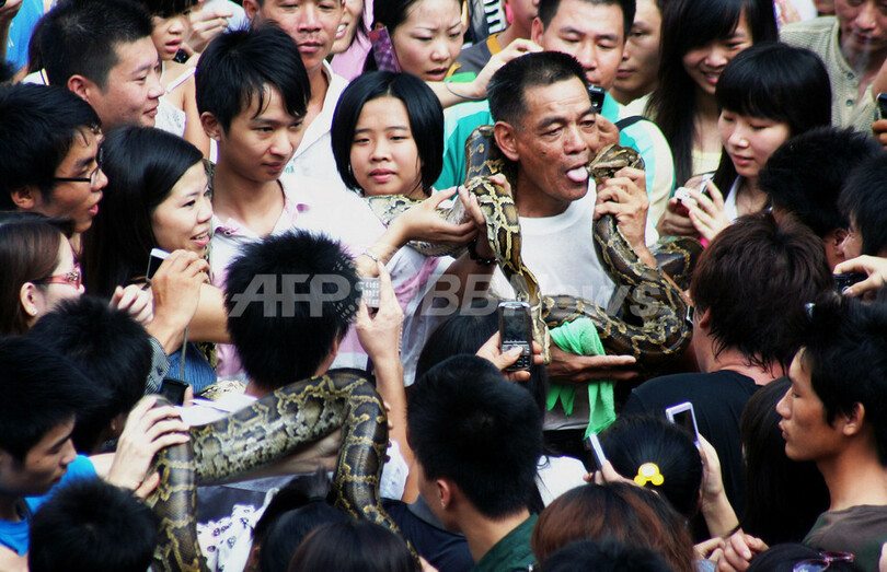 ニュース ライフ こぼれ話 ヘビをあがめる伝統行事、中国福建省 2009年8月30日 12:32 発信地:南平/中国 [ 中国・台湾 中国 ] このニュースをシェア ‹ › ❮ 2/2 ❯ 中国・福建省(Fujian)南平(Nanping)で開かれたヘビをあがめる伝統行事で、ヘビを肩に乗せた蛇使いの男性(2009年8月29日撮影)。(c)AFP 画像作成中 ! 【8月30日 AFP】中国・福建省(Fujian)南平(Nanping)で開かれたヘビをあがめる伝統行事で、ヘビにキスをする蛇使いの男性。福建省や台湾の一部の村では太陰暦の7月7日にあたるこの日にヘビをあがめる行事を行う。(c)AFP ライフ 一覧へ> メディア・報道関係・法人の方向け 写真・動画 購入のお問合せ>