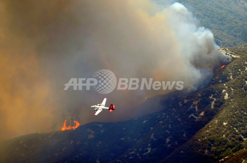 【9月1日 AFP】(写真追加)米カリフォルニア(California)州ロサンゼルス(Los Angeles)近郊で8月26日発生した山火事は、同31日も延焼を続け、焼失面積は3万4400ヘクタールとなった。この火災で消防士2人が死亡したほか、住民1万人が避難を余儀なくされている。近くにある重要通信施設にも延焼の懸念が高まっている。現場周辺の森林は乾燥して燃えやすい状態になっており、地元当局は「あらゆる方向に(炎が)広がっている」としている。(c)AFP