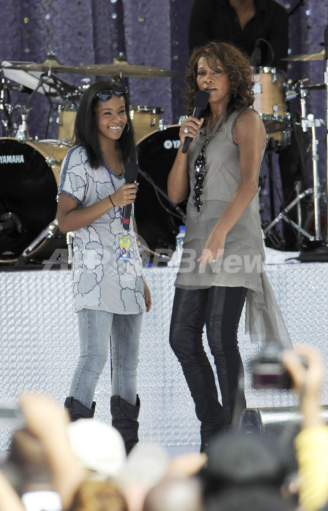 米歌手ホイットニー・ヒューストン(Whitney Houston)が1日、ABCテレビの番組『グッドモーニング・アメリカ(Good Morning America)』に出演、歌声を披露した。写真は、ステージに上がったヒューストン(右)と娘のボビー・クリスティナ・ブラウン(Bobbi Kristina Brown)さん(2009年9月1日撮影)。(c)AFP/Getty Images/Larry Busacca