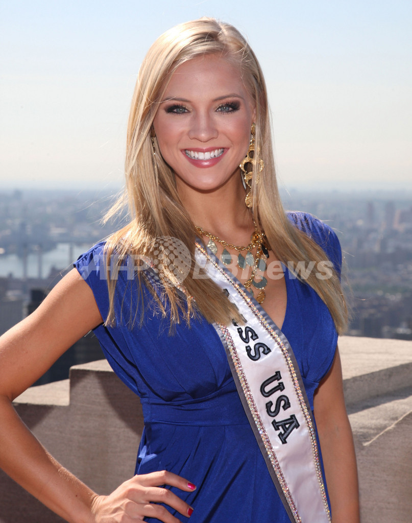 今年のミス・ユニバースに選ばれたベネズエラのステファニア・フェルナンデス(Stefania Fernandez)さんと米国代表のクリステン・ダルトン(Kristen Dalton)さんが2日、米ニューヨーク(New York)にあるロックフェラーセンター(Rockefeller Center)の屋上、トップ・オブ・ザ・ロック展望台(Top of the Rock Observation Deck)で撮影会を行った。写真はダルトンさん(2009年9月2日撮影)。(c)AFP/Getty Images/Jason Kempin