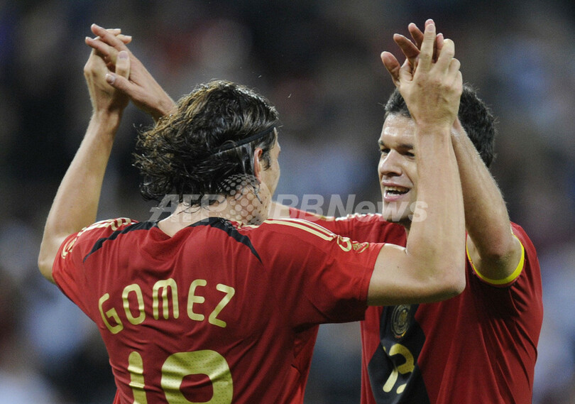ドイツは前半35分にマリオ・ゴメス(%%Mario Gomez%%)の得点で先制すると、後半32分にはメスト・エジル(%%Mesut Oezil%%)の代表初得点で加点した。写真は前半35分に先制点を決め、ミヒャエル・バラック(%%Michael Ballack%%)と喜ぶドイツの