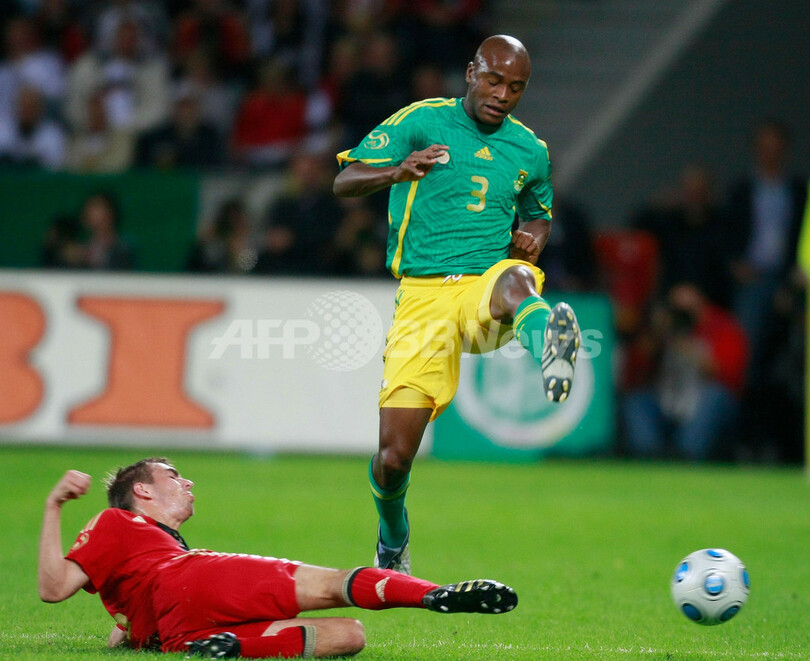 ドイツは前半35分にマリオ・ゴメス(%%Mario Gomez%%)の得点で先制すると、後半32分にはメスト・エジル(%%Mesut Oezil%%)の代表初得点で加点した。写真は南アフリカのトセポ・マシレラ(%%Tsepo Masilela%%)にタックルをするドイツのフィリップ・ラーム(%%Philipp Lahm%%、左)。(c)AFP/DDP/JUERGEN SCHWARZ