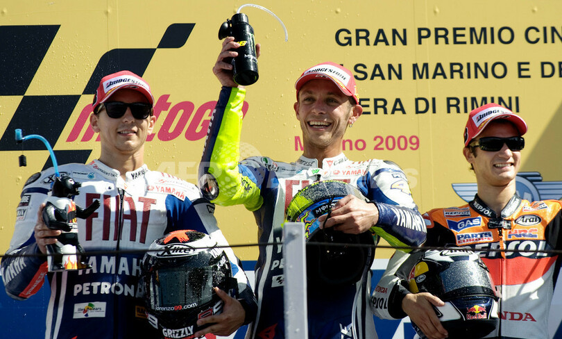 【9月7日 AFP】(写真追加)世界ロードレース選手権(WGP 2009)第13戦サンマリノGP、MotoGPクラス決勝。フィアット・ヤマハ(Fiat Yamaha)のバレンティーノ・ロッシ(Valentino Rossi、イタリア)が、44分32秒882でシーズン6勝目を挙げた。