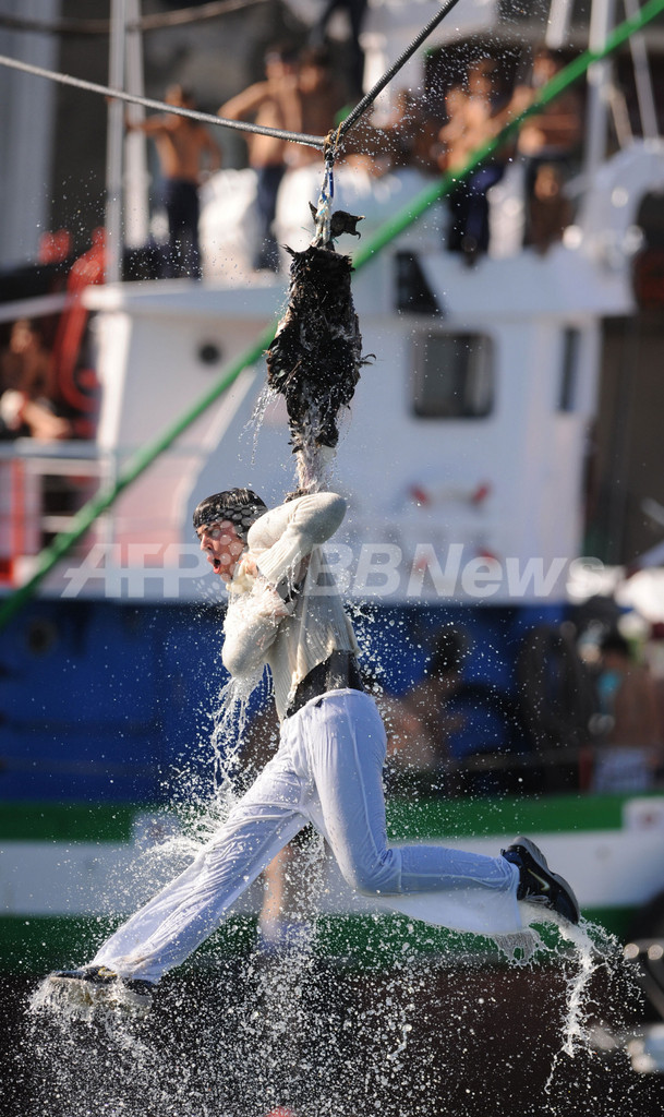 ニュース ライフ ガンにつかまり海中と空中を行ったり来たり、スペイン 2009年9月7日 12:52 発信地:レケイティオ/スペイン [ ヨーロッパ スペイン ] このニュースをシェア ‹ › ❮ 6/11 ❯ スペイン・バスク(Basque)地方の村レケイティオ(Lekeitio)の港で6日、「ガンの日(Antzar Eguna)」の催しが行われた。これは、海面上に張られたロープにつり下げられたガンに参加者がつかまり、ロープが上下し体が海中に沈んだり高く飛び上がる中、できるだけ長く耐えるというもの。写真は、ガンの首につかまる参加者(2009年9月6日撮影)。(c)AFP/RAFA RIVAS 画像作成中 ! 【9月7日 AFP】スペイン・バスク(Basque)地方の村Lekeitioの港で6日、「ガンの日(Antzar Eguna)」の催しが行われた。これは、海面上に張られたロープにつり下げられたガンに参加者がつかまり、ロープが上下し体が海中に沈んだり高く飛び上がる中、できるだけ長く耐えるというもの。(c)AFP ライフ 一覧へ> メディア・報道関係・法人の方向け 写真・動画 購入のお問合せ>