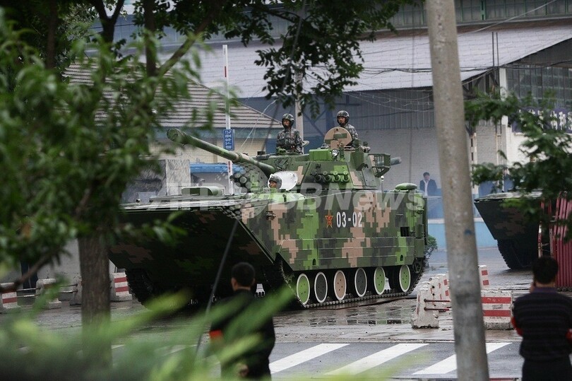 Beijing)中心部で6日、翌月1日の建国60年周年に向けた軍事パレードの予行演習が行われ、戦車やミサイル積載車両など数百両が天安門広場(