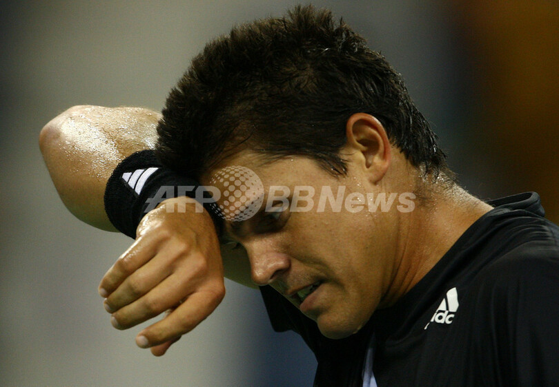 マレーは4回戦で大会第16シードのマリン・チリッチ(%%Marin Cilic%%、クロアチア)と対戦する。写真はリストバンドで汗を拭うタイラー・デント。(2009年9月6日撮影)(c)AFP/Getty Images/Julian Finney