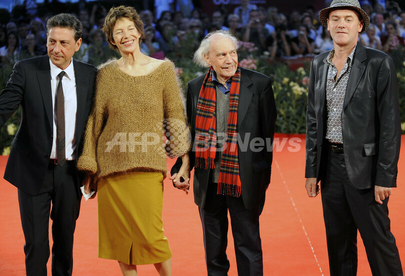 イタリア北部ベネチア(Venice)で開催中の第66回ベネチア国際映画祭(Venice International Film Festival)で7日、フランス映画『36 Vues du Pic Saint Loup』が上映され、主演のジェーン・バーキン(Jane Birkin)が登場した。この作品は、コンペ部門に出品されている。写真は、レッドカーペットに登場した(左から)出演者のセルジオ・カステリット(Sergio Castellitto)、バーキン、ジャック・リヴェット(Jacques Rivette)監督、ジャック・ボナフェ(Jacques Bonnaffe、2009年9月7日撮影)。(c)AFP/Damien Meyer