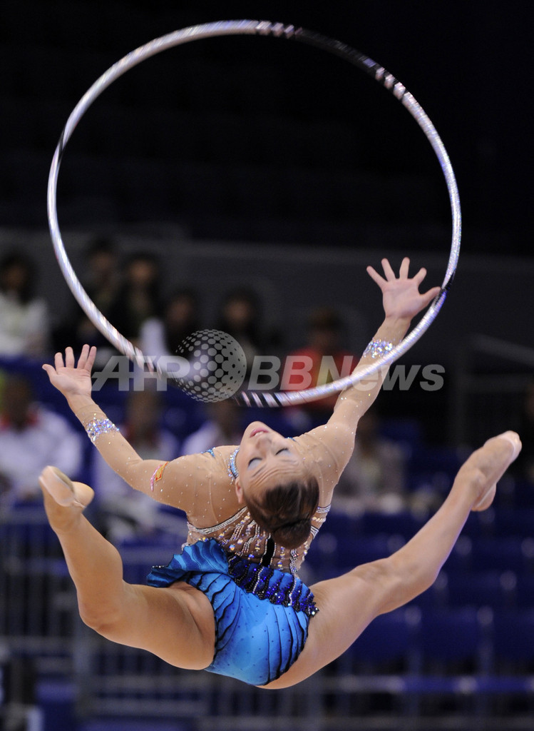 ロープの3位には27.575点を記録したアンナ・ベッソノワ(%%Anna Bessonova%%、ウクライナ)が、フープの3位には27.150点を記録したメリティナ・スタニウタ(%%Melitina Staniouta%%、ベラルーシ)が入った。写真はフープの演技をするエフゲニヤ・カナエワ。(2009年9月7日撮影)(c)AFP/KAZUHIRO NOGI