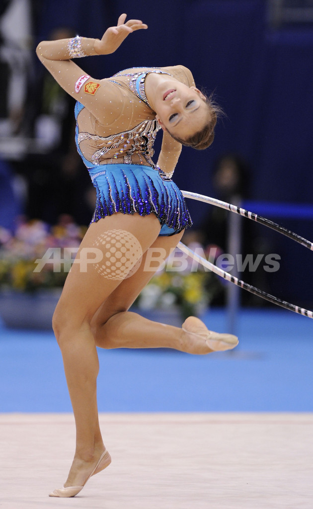 ロープの3位には27.575点を記録したアンナ・ベッソノワ(%%Anna Bessonova%%、ウクライナ)が、フープの3位には27.150点を記録したメリティナ・スタニウタ(%%Melitina Staniouta%%、ベラルーシ)が入った。写真はフープの演技をするエフゲニヤ・カナエワ。(2009年9月7日撮影)(c)AFP/KAZUHIRO NOGI