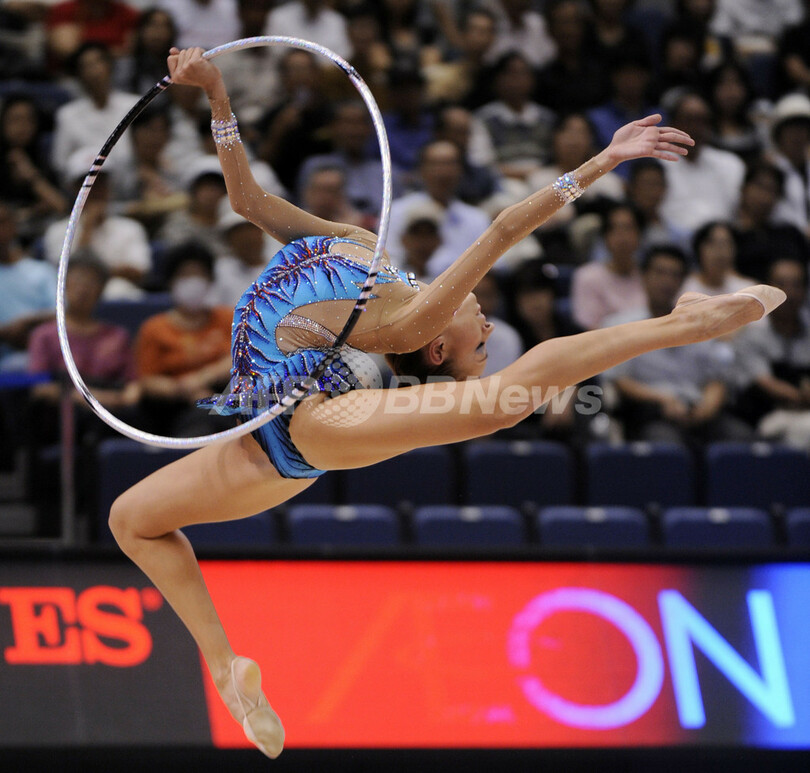 ロープの3位には27.575点を記録したアンナ・ベッソノワ(%%Anna Bessonova%%、ウクライナ)が、フープの3位には27.150点を記録したメリティナ・スタニウタ(%%Melitina Staniouta%%、ベラルーシ)が入った。写真はフープの演技をするエフゲニヤ・カナエワ。(2009年9月7日撮影)(c)AFP/KAZUHIRO NOGI