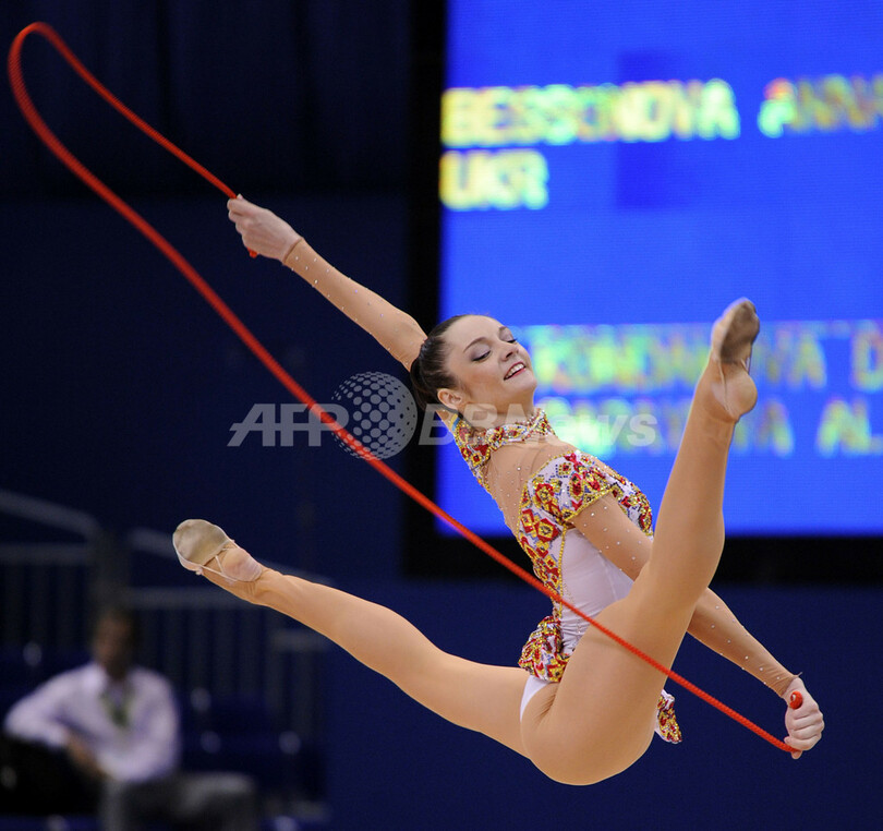 ロープの3位には27.575点を記録したアンナ・ベッソノワ(%%Anna Bessonova%%、ウクライナ)が、フープの3位には27.150点を記録したメリティナ・スタニウタ(%%Melitina Staniouta%%、ベラルーシ)が入った。写真はロープの演技をするアンナ・ベッソノワ。(2009年9月8日撮影)(c)AFP/KAZUHIRO NOGI