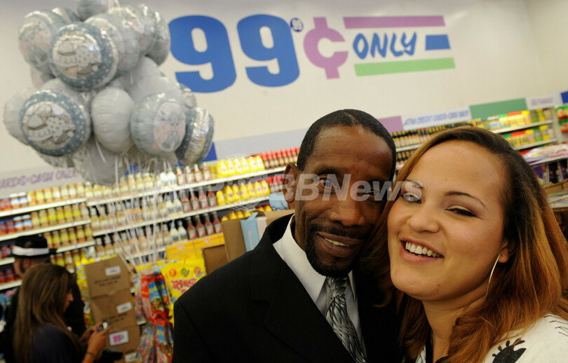 【9月9日 AFP】(写真追加)米国版100円ショップチェーン「99センツ・オンリー・ストアズ(99 Cents Only Stores)」は9日、不景気の昨今お金がないという9組のカップルに、99セント(約91円)の結婚式を提供した。