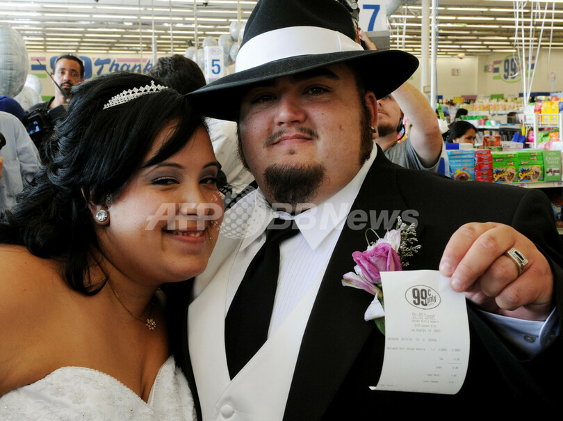 【9月9日 AFP】(写真追加)米国版100円ショップチェーン「99センツ・オンリー・ストアズ(99 Cents Only Stores)」は9日、不景気の昨今お金がないという9組のカップルに、99セント(約91円)の結婚式を提供した。